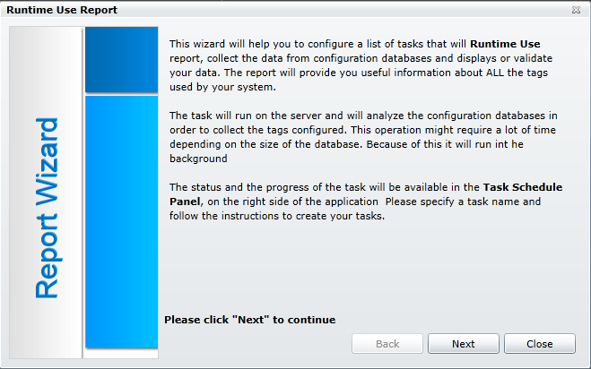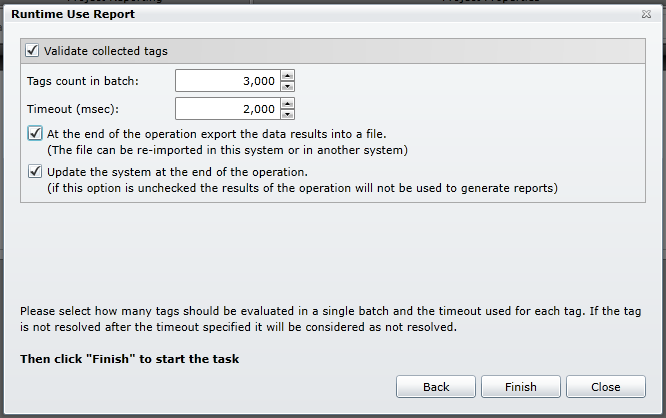 The Runtime Use Report is more complex than the Configured Tag Report. Three independent tasks are created (Creating Report, Tag Collection, Validation). All the tasks are optional, but at least one task must be selected. It’s also possible to create each task without the wizard, using the menu in the task panel.