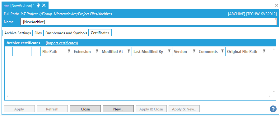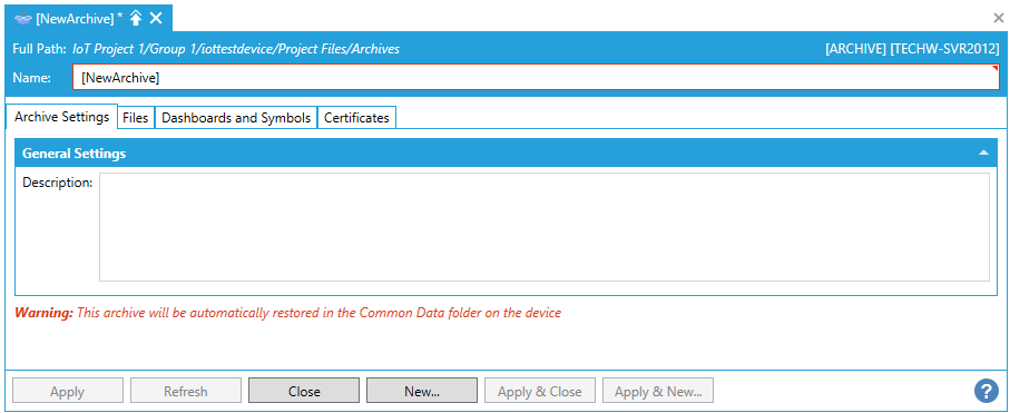 1. This opens the Archive properties in the Workbench, shown below. Enter a Name for the archive in the text entry field.