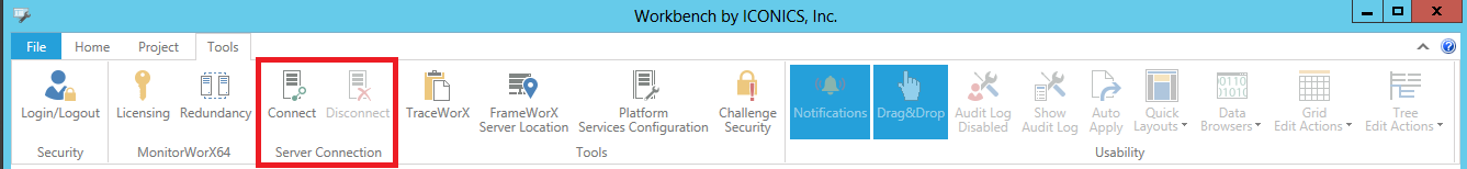 The Server Connection section of the Tools ribbon in the Workbench contain two options: