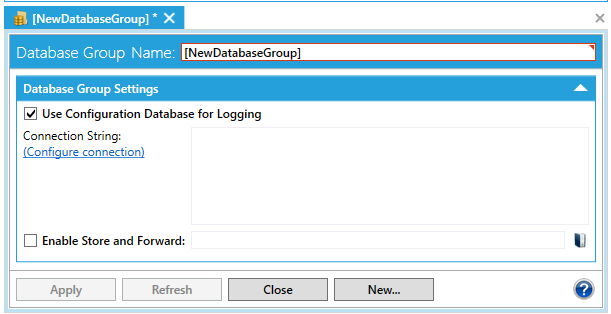 The TrendWorX64 Logger configuration database can connect to one or more SQL logger databases. You can specify any number of database groups, or collections of logger databases, within a single configuration database. When the configuration database is active and data logging is occurring, TrendWorX64 Logger stores data from the different OPC data sources into a logger database. You can configure a database group by using the Database Group form.