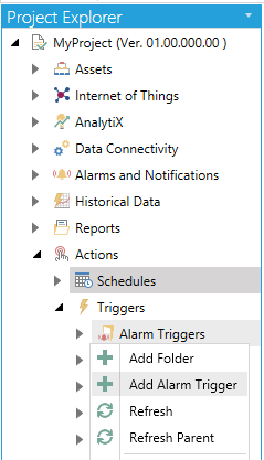 Open the Workbench and expand the Actions node and then the Triggers node. Right-click on the Alarm Triggers node then click on Add Alarm Trigger, as shown below.