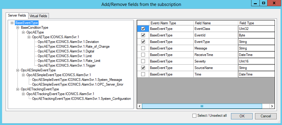 In the left side of the window, expand the selections to select from the BaseEventTypes. When a BaseEventType is selected, you'll be able to see the associated Event/Alarm Types, Field Names, and Field Types. Click the checkbox to the right of each field that you would like to include in the subscription. You also have the option to Select/Unselect all (via separate checkbox in the bottom right of the window). Click on OK to accept your changes and return to the New Alarm Trigger Properties. Your selected fields will now appear in the Alarm Subscription section.