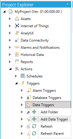 1. Open the Workbench and expand the Actions node and then the Triggers node. Right-click on the Data Triggers node then click on Add Data Trigger, as shown below.