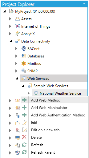 The sub-branches beneath a newly created Web Service (as mentioned in Create a New Web Service) allow you to create a Web Method, which allows you to select from different data sets that can be selected from later within an integrated ICONICS application (GraphWorX64, etc.).