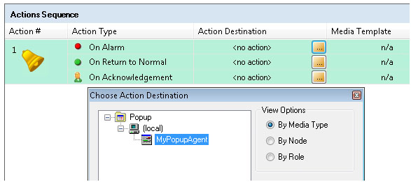 Set the Action Destination for the “On Alarm” Action Type to locate the Popup Agent that was already created.