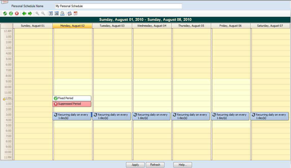 Double-click into the calendar and select one of the three options on the toolbar to create the schedule. You create the schedule by adding recurring periods, fixed periods, and suppressed time periods. To see a calendar with examples, click hereExamples of a Fixed Period, Suppressed Period, and Recurring Period