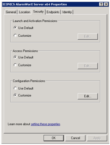 - Select the Security tab and make sure that it is using the defaults for Launch and Activation Permissions and Access Permissions. The screen should look similar to Figure 4.