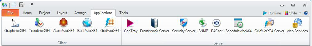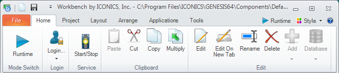 Each ICONICS application or tool that you open in the Workbench Classic has its own ribbon. As you work in the Workbench Classic, you will learn how to integrate custom actions and tools inside the ribbon. The Home tab changes depending on the provider, tool, or application you are working with; the example shown below is just one example of many. The ribbon also contains a File menu, Project tab, Layout tab, Arrange tab, Applications tab (where you can switch to a different provider in the project), and Tools tab.