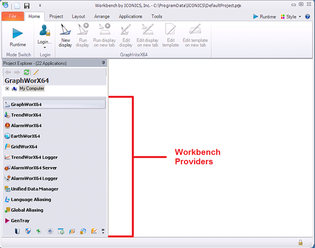 The GENESIS64 Workbench Classic saves all of your tools, application providers, and settings with your projects in their project files so that you can reopen and reuse the project easily. In each project are stored: