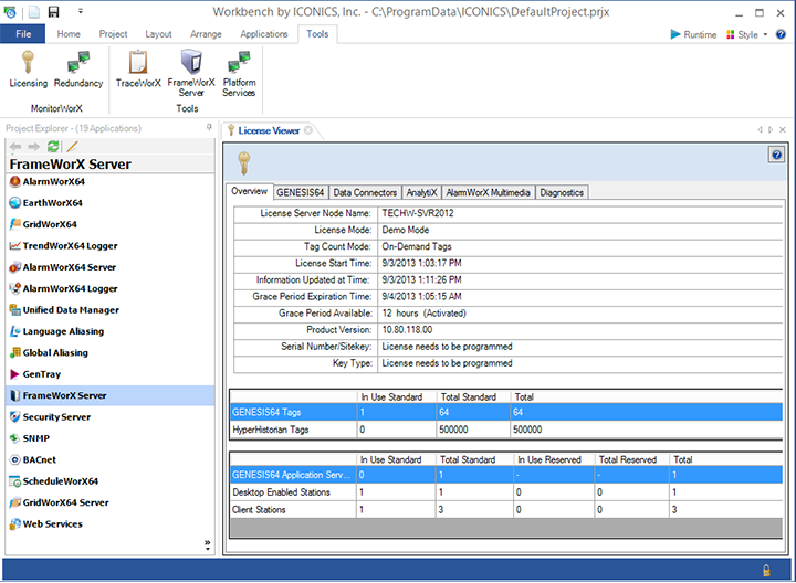 License Viewer (via MonitorWorX) Displayed in the GENESIS64 Workbench