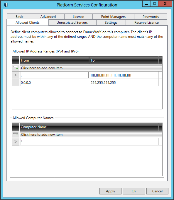 1. The Allowed Clients tab allows users to define which client computers are allowed to connect to the FrameWorX Server. Clients from other nodes will not be allowed. The client computer must match both lists: the Allowed IP Address Ranges (IPv4 and IPv6) and the Allowed Computer Names. Use * for any name. Use IPv4 and IPv6 addresses (Windows uses IPv6 internally). All clients are allowed by default.