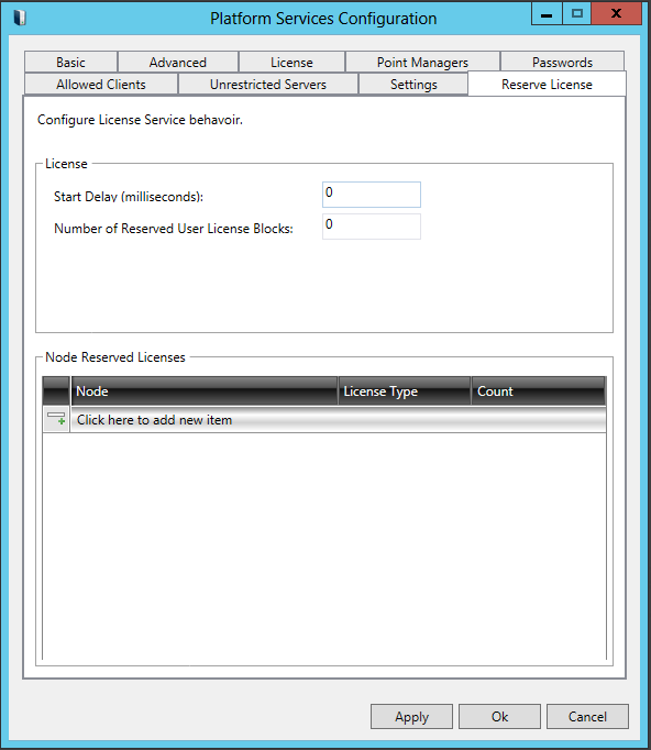 The bottom Node Reserved Licenses section allows users to pre-allocate license types to a specific node. Enter a Node and then select a specific License Type and then enter a number in the Count column for the number of pre-allocated licenses to reserve for that node (in most cases, the Count number will be 1).