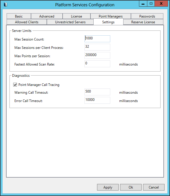 1. The Settings tab allows users to set parameters for Server Limits and Diagnostics.