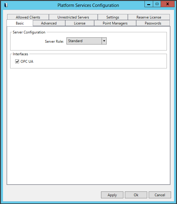 In the Interfaces section of the Basic tab of the Platform Services Configuration window, you can specify, via checkbox, whether or not to use the OPC UA interface.