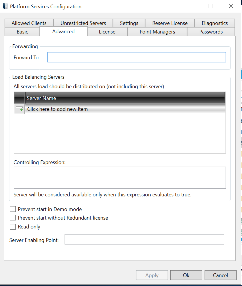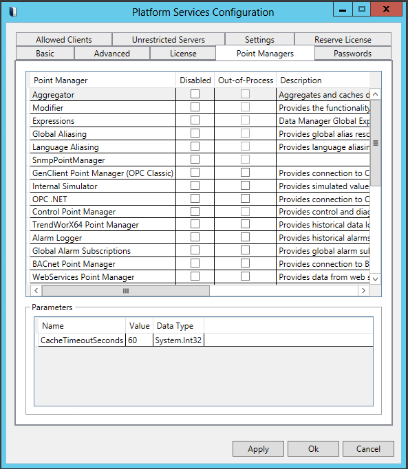 1. The Point Managers tab of the Platform Services Configuration window allows you to Disable/Enable and/or set  "Out-of-Process" status for specific point managers for multiple integrated data components (aggregators, aliases, data connectors, databases, histories, etc). Point Managers are plug-in modules running within the process of a FrameWorX Server. They may be disabled when their functionality is not needed, in order to minimize the FrameWorX Server’s memory footprint or for troubleshooting. Also, they may be set up to run out-of-process. Then, they run in a separate process but there is a slight performance hit when running out-of-process.