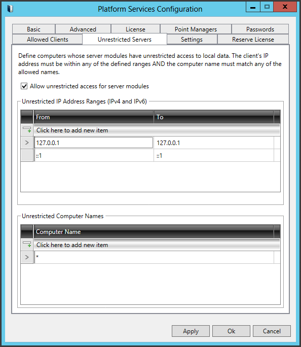 1. The Unrestricted Servers tab allows users to define which FrameWorX Servers (acting as clients) can connect to the FrameWorX Server with no security restrictions. The client computer must match both lists: the Unrestricted IP Address Ranges (IPv4 and IPv6) and the Unrestricted Computer Names. Use * for any name. Use IPv4 and IPv6 addresses (Windows uses IPv6 internally). Unrestricted access is only allowed for other FrameWorX Servers acting as clients. There are no unrestricted clients by default.