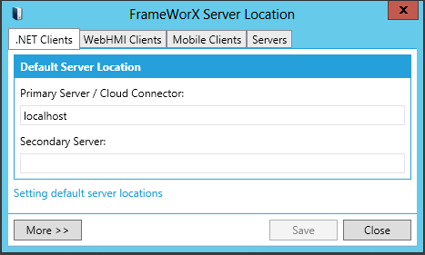 To enable redundancy, specify the secondary FrameWorX Server location in the Secondary Default Server Name field. The secondary server will take over if the primary server becomes unavailable. (Leave this field empty to switch off redundancy.)