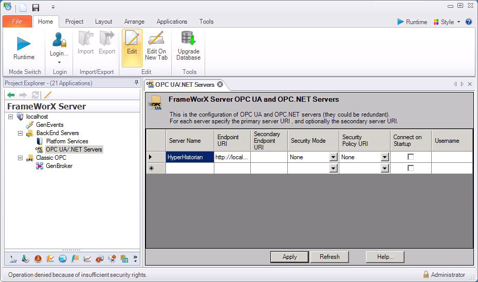 Expand the server, expand BackEnd Servers, then double-click OPC UA/.Net Servers. The OPC UA/.Net Servers tab appears.