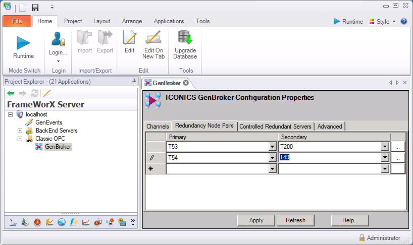 For AlarmWorX64 Server, you can define node pairs through the GENESIS64 Workbench, but for AlarmWorX32 Server and TrendWorX32 Server, use GenBroker. |