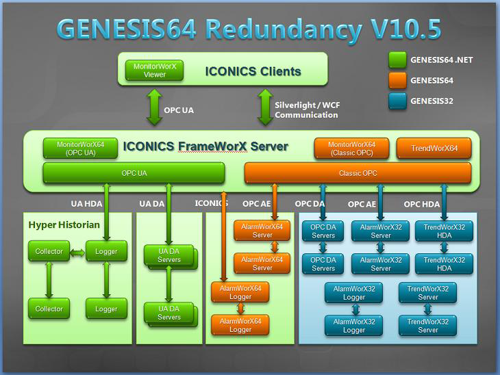 GENESIS64 supports redundancy to both 64-bit Servers (UA DA, UA HDA, OPC DA, OPC AE) and 32-bit Servers (OPC DA, OPC AE, OPC HDA). This means that in GENESIS64 you can set up redundant servers for: