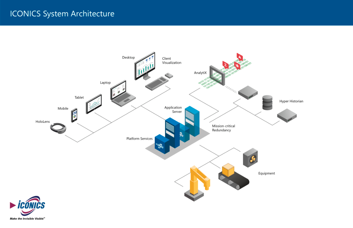 The following image illustrates how ICONICS software components fit together to provide data visualization, analytics, historian and mobility capabilities. GENESIS64 can integrate with AnalytiX, Hyper Historian, MobileHMI and multiple other ICONICS software components to help customers "make the invisible visible" and make the best use of their valuable data.