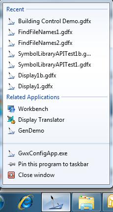 Windows 7 jump lists give you one more way to find GraphWorX64 files and related applications. The GraphWorX64 jump list is available from the GraphWorX64 entry in the Start menu. Alternatively you can right-click the GraphWorX64 icon in the task bar to pop up its jump list, ask shown below. Notice how the jump list shows recent GraphWorX displays and lists related applications like the Workbench and the Display Translator. For information about how to use a jump list, refer to Microsoft Windows 7 documentation.