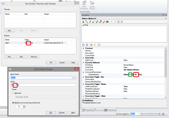 NOTE: If an alias value includes an 'equals' character, this will be encoded as “&=” (as you can see in the image below - within the Property Grid). This encoding occurs so that it can be differentiated from the “=” that separates the alias name and the alias value (circled in green in the same example below). The “Set Global Themes and Aliases” GUI will do this encoding for you (notice the items circled in red), but if you want to type the string directly into the Property Grid, you will need to know proper the encoding to use.