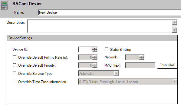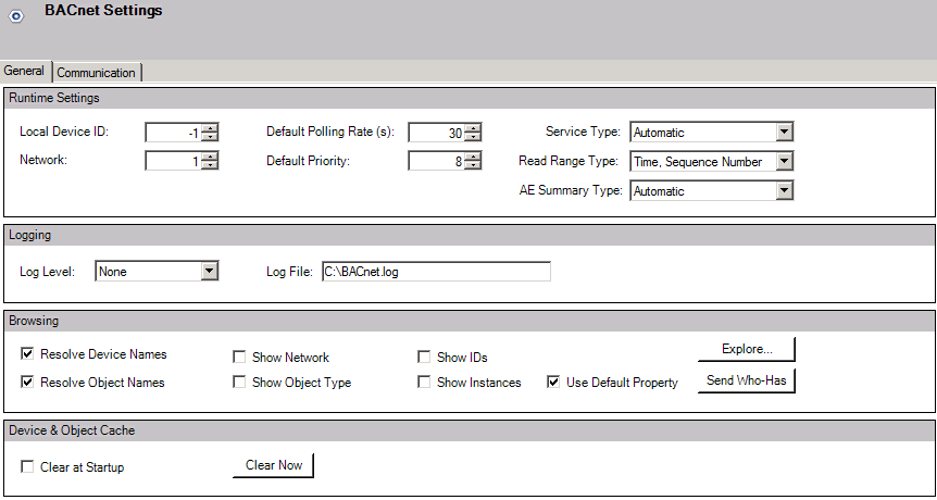 4. Enter the settings for: APDU Timeout, APDU Segment Timeout, and APDU Retries in the ‘Communication’ tab and Default Polling Rate and Default Priority in the ‘General tab’
