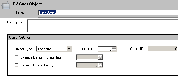 4. Specify the object Type in the Object Type dropdown menu (AnalogInput by default) and specify the right Instance # (usually 1). Object ID should be generated automatically.