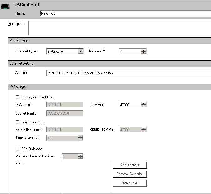 NOTE: Please notice that default BACnet communication is based on IP protocol, where default port (47808) can be changed (under the Ports) if you really need it, but in most of the cases you can run with the default settings. Also notice that Ports in Workbench64 are ICONICS proprietary interfaces created specifically for BACnet communication where the IP port is not equal to a Workbench64 port.