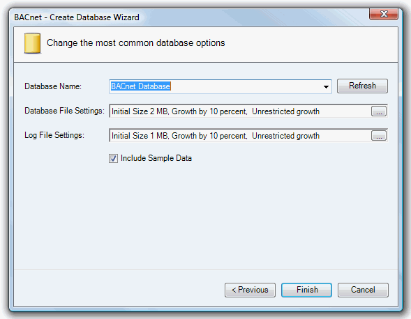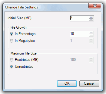 You will then be able to Change the most common database options, including naming the New database, as well as setting Database and Log File Settings. Clicking the ellipses button […] brings up a secondary box to change size settings (Initial Size, File Growth and Maximum File Size). Click OK once you have made your database file size changes, then Finish.