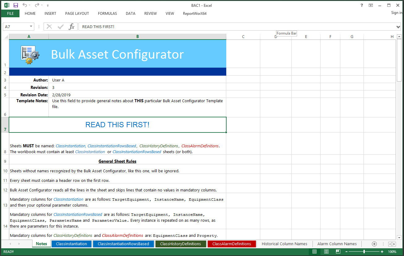 This Notes sheet describes further use of the Excel file and its integration with the Bulk Asset Configurator utility. In addition, you can enter information for this specific file on the Notes sheet, including Author, Revision number, Revision Date and additional Template Notes.