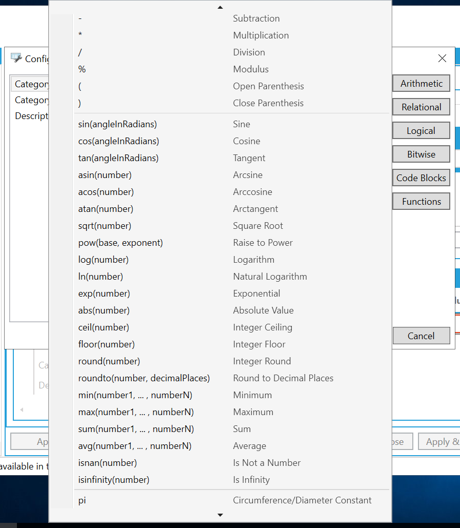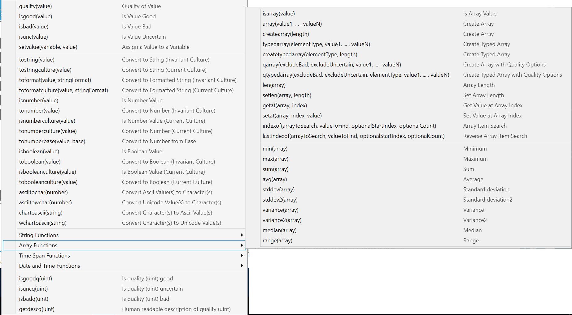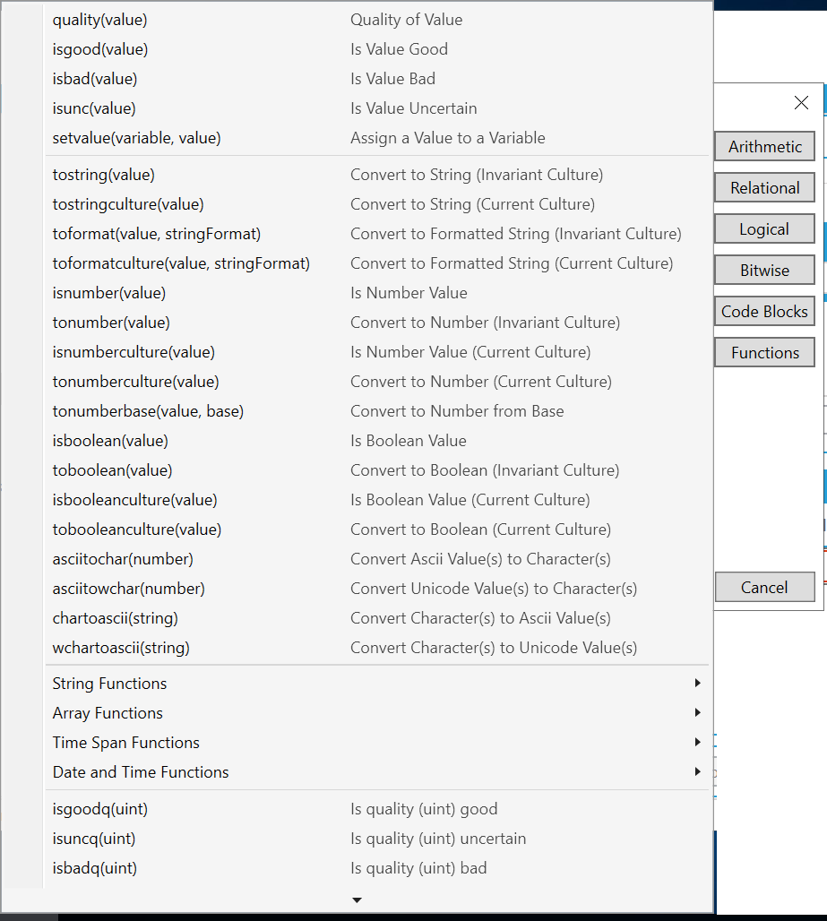 Note. If you are creating calculated tags in Hyper Historian, also refer to the functions described in the Performance Calculation Functions topic in Hyper Historian. |