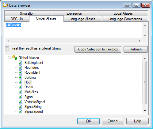 A global alias is a variable that is stored in the Global Aliasing System database for reuse in multiple places within the various GENESIS64 applications. If you wanted to use the word "Floor" as a variable throughout an application, you would select the Floor global alias from the Global Alias tab of the Unified Data Browser. The syntax of the variable is displayed in the upper text box. For global aliases, the syntax is: