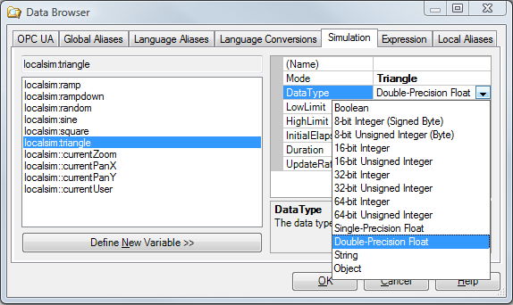 GraphWorX64 provides several different variables for local simulation which are useful for testing or simulating tags in GraphWorX64 displays. The following simulation variables are available for your use in the Simulation tab; each makes use of the localsim function. You can create additional variables by clicking the Simulation tab's Define New Variable button. The properties that define each variable are described following this list.