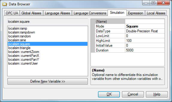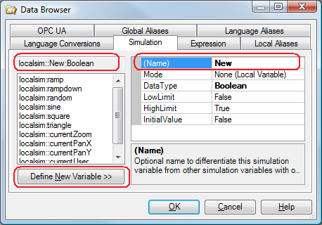 The Define New Variable button in the Simulation tab allows you to define a new variable. After you click this button, enter values in the properties on the right side of the Simulation tab. After you enter a name in the Name property, the name appears at the top of the list of simulation tags, preceded by the function localsim::. To see an example, click here.