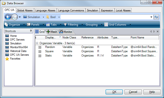 The Unified Data Browser also exposes some variable data simulators meant to simulate tags and real-time data. To access a simulated tag, click on the Simulation node in the Shortcuts pane of the browser's OPC UA tab, as shown in the figure below in the Grid view.