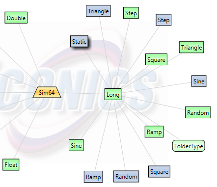 The actual simulator functions themselves are contained within the different datatypes as shown in the figure below. Expanding the Long datatype displays the purple rectangles of the DataTypeObject: Static, Triangle, Step, Sine, Square, Random, and Ramp  which are the ultimate output that you select for your simulator. The green squares: Step, Square, Triangle, Random, Ramp, and Sine are folders; each expands to show additional content. As you select a simulator the address for the node appears in the Address bar. Shown selected below is the Static value, which would return a single unvarying value and is located on the path: @sim64:Long.Static("Static1").Value.