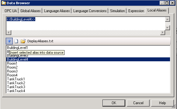 When you browse for data in GraphWorX, the Data Browser displays the Local Aliases tab, where you can select a local alias from a file. For more information, refer to Local Aliases Tab on the Data Browser.