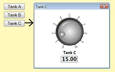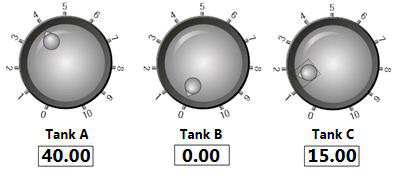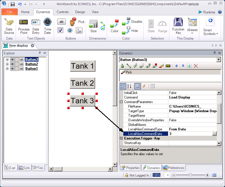 In a different example, the click knob is added to a display that is used as a pop-up dialog at runtime. On the main display, there are three buttons (one for Tank A, one for Tank B, and one for Tank C). By clicking one of the Tank buttons, the runtime user pops up a dialog box that shows information about that tank, including the a click knob. In this case, you would set the data source value of click knob at the display level. The value would be passed to the display by the button that the user clicks. A description of how to set this up is provided below in Setting the Alias Value at the Display Level and Passing Multiple Local Aliases for an Object.