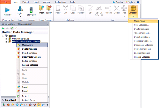 right-click on the database node in the Project Explorer and select the Make Active command, or drop down the Database icon on the ribbon's Home tab. (Both methods are shown in the figure below.) As a result, in the Project Explorer the green database icon for the active database replaces the red database icon for the inactive database.