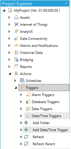 1. Open the Workbench and expand the Actions node and then the Triggers node. Right-click on the Time Triggers node then click on Add Date/Time Trigger, as shown below.