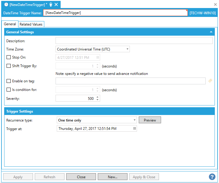 1. This opens the New Date/Time Trigger Properties, shown below.