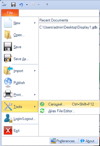 In configuration mode, from the GraphWorX64 File menu, select Tools, then Carousel.