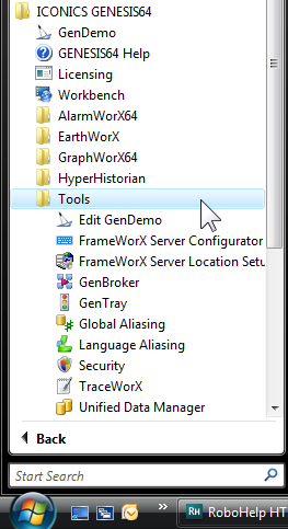 There are two places that you can start the ICONICS GENESIS64 tools. The first place is the Tools folder on the Start menu, as shown in the following figure.