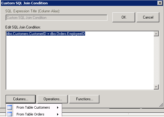 If you select multiple tables, you can join the tables together by simply dragging a data column from one table over to the corresponding field in another table. An arrow appears, indicating that a join between the two tables exists, as shown in the figure below. In this example, the CustomerID column in the Customers table is linked to the CustomerID column in the Orders table.