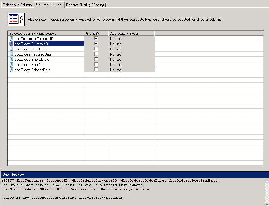 As appropriate, assign an Aggregate Function (such as a Count, Average, Maximum, Minimum, Sum, Standard Deviation, etc.) to each of the columns you did not include in the grouping list. To set an Aggregate Function, click on the column or expression name; this enables the Aggregate Function’s drop-down list for the column or expression. The records of columns that are assigned the same aggregate function will be grouped together in the query result.