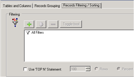 Use the bottom half of the Records Filtering / Sorting tab, shown above, to sort the database records. Now that you have defined parameters for filtering or restricting data from columns you can specify the priority by which the columns and the records in each column are sorted. You can choose to sort on any of the selected columns, as shown in the figure above, or leave them unsorted.