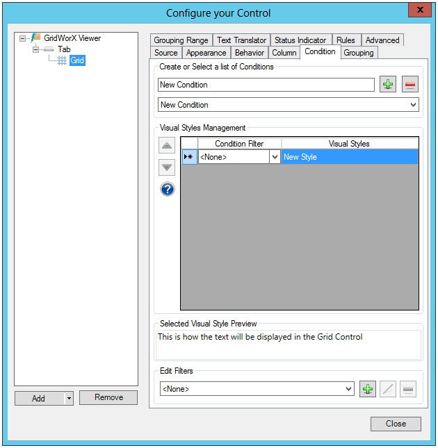 A condition is made up of a filter and a visual style. In runtime, if the filter is true for a row, then the related visual style is applied to the row. You can create as many conditions as you have filters and visual styles. When creating a new condition, you specify the values, the condition level's name, and how each condition appears at runtime.