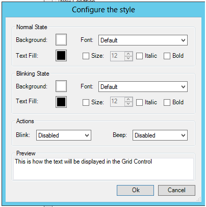 If you double-click within the Visual Styles column, you'll see an ellipsis button appear. Click on the ellipsis button to access the Configure the style window shown below. In this window, you can update the Normal State (including Background color, Font, Text Fill color, Text size and style), Blinking State (including Background color, Font, Text Fill color, Text size and style) and Actions (Blink [Disabled, Slow, Normal or Fast] and/or Beep [Disabled, Slow, Normal or Fast]). The Preview section at the bottom of the window will show your text changes will be displayed in the Grid Control.
